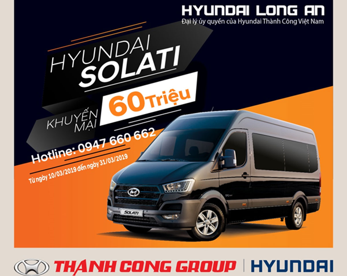 Kể từ ngày 10/03/2019 đến 31/03/2019, người tiêu dùng, đặc biệt là các đơn vị vận tải sẽ có cơ hội mua xe giá tốt với mức ưu đãi lên đến 60 triệu đồng cùng gói quà tặng phụ kiện đặc biệt. Đây là chương trình khuyến mãi hấp dẫn nhất trong tháng 03 mà Hyundai Long An muốn dành tặng cho quý khách hàng khi mua Solati.