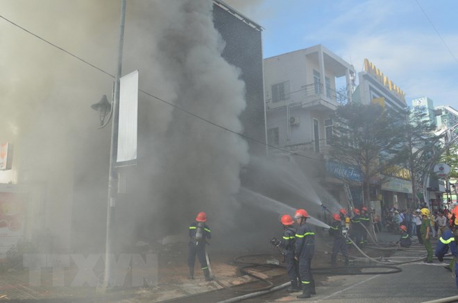Lực lượng Cảnh sát phòng cháy chữa cháy thành phố Đà Nẵng tham gia dập lửa tại quán Bar Leo Night. (Ảnh: Đinh Văn Nhiều/TTXVN)