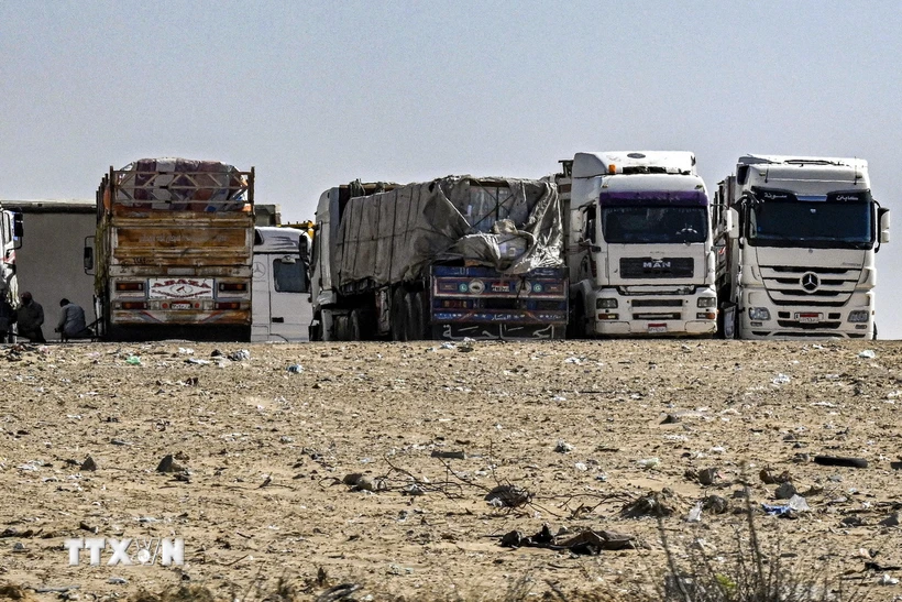 Xe tải chở hàng viện trợ cho Dải Gaza tập trung gần cửa khẩu Rafah bên phía Ai Cập, ngày 23/3. (Ảnh: AFP/TTXVN)