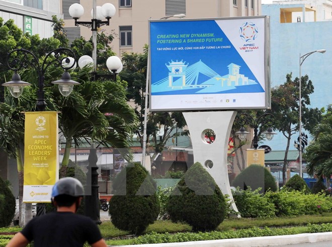 Panô chào mừng Tuần lễ cấp cao APEC 2017 trên các tuyến đường tại Đà Nẵng. (Ảnh: Trần Lê Lâm/TTXVN)