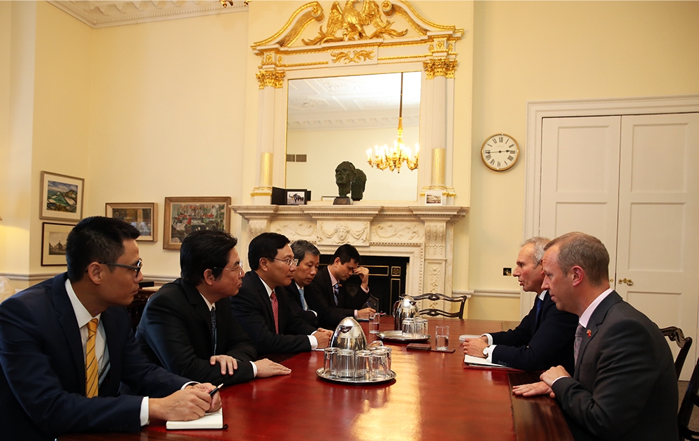 Phó Thủ tướng Phạm Bình Minh đề nghị Chính phủ Anh quan tâm, khuyến khích các doanh nghiệp Anh đẩy mạnh đầu tư, kinh doanh tại Việt Nam, tăng cường hợp tác trong các lĩnh vực nhiều tiềm năng như giáo dục, khoa học công nghệ và du lịch, ủng hộ Việt Nam ứng vào cử vị trí Ủy viên không thường trực Hội đồng Bảo an Liên hợp quốc nhiệm kỳ 2020 - 2021. Trao đổi về các vấn đề quốc tế, hai bên khẳng định tiếp tục phối hợp trên các diễn đàn quốc tế trong đó có Liên hợp quốc, ủng hộ duy trì hoà bình, ổn định, tự do, an ninh, an toàn hàng không và hàng hải, giải quyết tranh chấp bằng các biện pháp hoà bình, trên cơ sở luật pháp quốc tế, trong đó có Công ước của Liên hợp quốc về Luật Biển 1982. Phó Thủ tướng Phạm Bình Minh đề nghị Chánh Văn phòng Nội các Liddington chuyển lời mời Thủ tướng Anh Theresa May thăm Việt Nam của Thủ tướng Chính phủ Nguyễn Xuân Phúc.