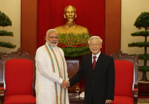Tổng Bí thư Nguyễn Phú Trọng nhiệt liệt hoan nghênh chuyến thăm của Ngài Thủ tướng Ấn Độ Na-ren-đờ-ra Mô-đi; đánh giá cao ý nghĩa quan trọng của chuyến thăm, thể hiện sự coi trọng của chính phủ Ấn Độ và cá nhân Ngài Thủ tướng đối với việc thúc đẩy mối quan hệ hữu nghị truyền thống tốt đẹp giữa hai nước. Tổng Bí thư chúc mừng những thành tựu to lớn về mọi mặt mà nhân dân Ấn Độ đã đạt được trong công cuộc xây dựng và phát triển đất nước thời gian qua; khẳng định Đảng Cộng sản Việt Nam và nhân dân Việt Nam luôn coi trọng mối quan hệ hữu nghị truyền thống và Đối tác chiến lược toàn diện với Ấn Độ; ủng hộ chính sách “Hành động Hướng Đông” và sự gia tăng hiện diện cũng như những kết nối về mọi mặt của Ấn Độ với khu vực Đông Nam Á.