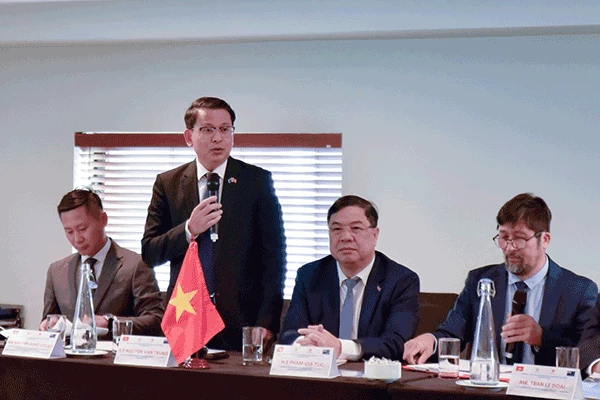 Ðại sứ Nguyễn Văn Trung trong buổi làm việc cùng đoàn xúc tiến thương mại Nam Ðịnh tại New Zealand. Ảnh: TTXVN