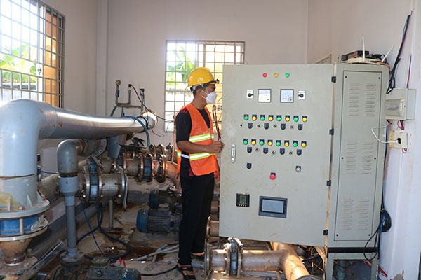 Nhân viên của Trung tâm nước kiểm tra tình hình hoạt động của Hệ thống cấp nước tập trung xã Nhơn Ái, huyện Phong Ðiền.