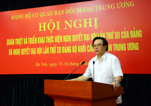 Phát biểu tại Hội nghị, đồng chí Hoàng Bình Quân, Ủy viên Trung ương Đảng, Trưởng Ban Đối ngoại Trung ương nêu rõ: Đại hội lần thứ XII của Đảng đã thảo luận nhiều quyết sách và thông qua các Văn kiện quan trọng, có ý nghĩa chiến lược đối với sự phát triển của đất nước. Văn kiện Đại hội XII là sản phẩm kết tinh trí tuệ của toàn thể cán bộ, đảng viên và nhân dân cả trong và ngoài nước; được xây dựng trên cơ sở tổng kết sâu sắc lý luận và thực tiễn 30 năm đổi mới đất nước, hoàn thiện thêm một bước quan trọng trong việc hoạch định hệ thống các quan điểm chỉ đạo, đưa đất nước tiếp tục đi theo con đường xã hội chủ nghĩa trên nền tảng chủ nghĩa Mác – Lênin và tư tưởng Hồ Chí Minh…