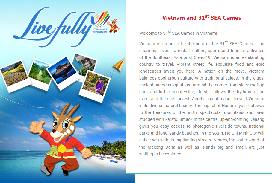 Nhân dịp này, Tổng cục Du lịch đã chủ động xây dựng một chuyên trang quảng bá du lịch Việt Nam tại địa chỉ https://seagames31.vietnamtourism.gov.vn. Chuyên trang giới thiệu tổng quan về du lịch Việt Nam, các thông tin cần thiết đối với du khách quốc tế khi vào Việt Nam như thủ tục visa, xuất nhập cảnh, kiểm soát y tế…
