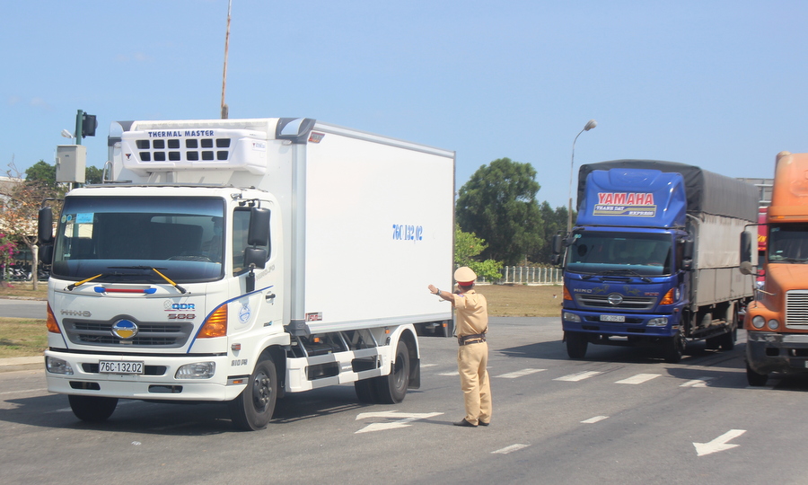 | Dù trời đang rất nắng và mật độ xe qua lại dày đặc, nhưng cán chiến sỹ CSGT Công an tỉnh Quảng Nam vẫn liên tục làm việc |