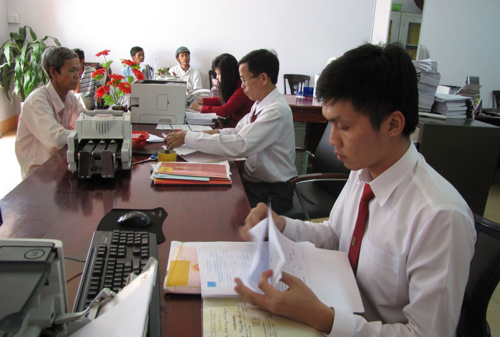 Nhân viên ngân hàng thực hiện giao dịch với khách hàng
