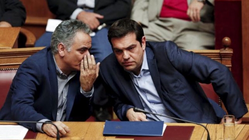 Thủ tướng Hy Lạp Alexis Tsipras (bên phải) nói chuyện với Bộ trưởng Năng lượng Hy Lạp Panos Skourletis trong phiên họp Quốc hội Hy Lạp, tại Thủ đô Athens, Hy Lạp, ngày 22-7-2015. (Ảnh: Reuters)