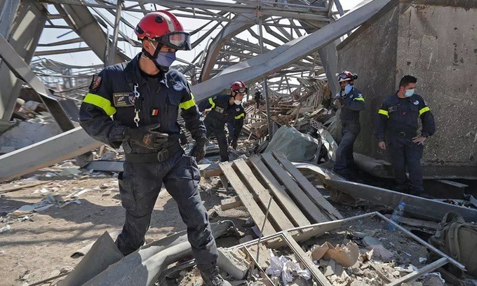 Các nhân viên cứu hộ tìm kiếm trong đống đổ nát tại cảng Beirut ngày 7/8. Ảnh: AFP.