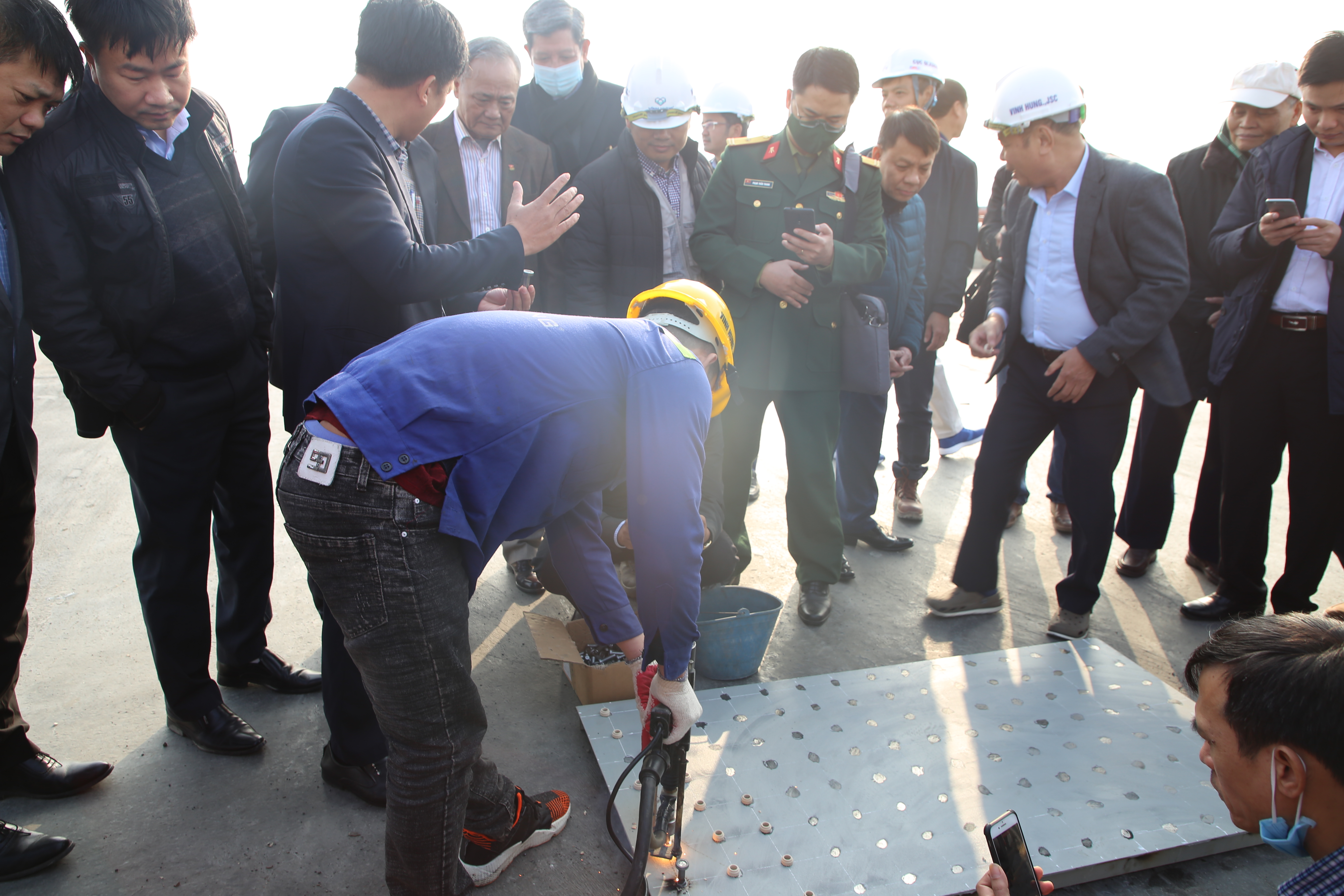 | Các cơ quan chức năng thẩm định công nghệ xử lý mặt nền cầu Thăng Long. |