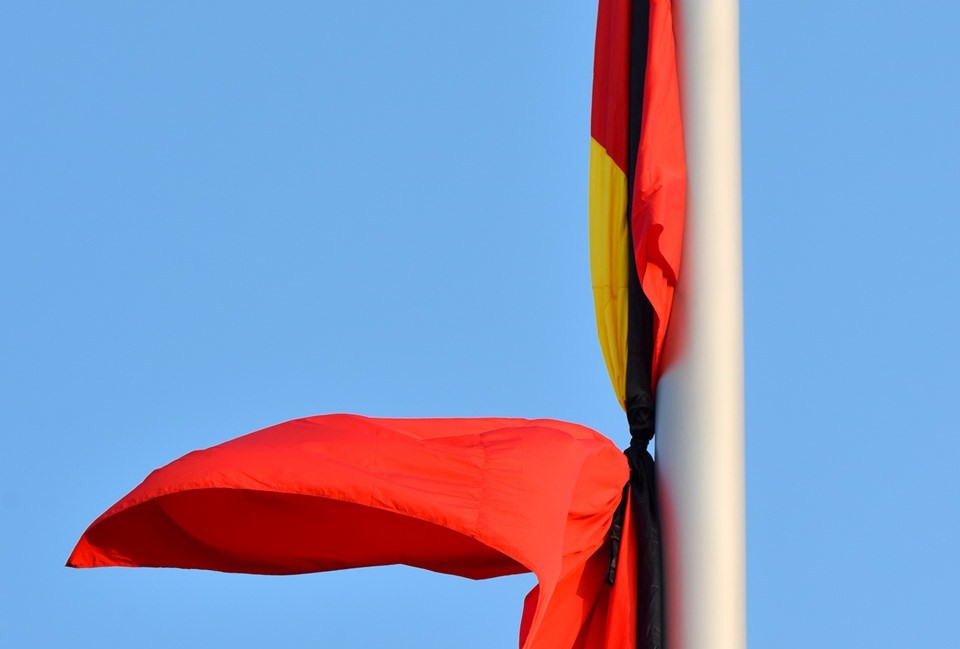 | Cờ rủ với dải băng tang được buộc vào Quốc kỳ. |