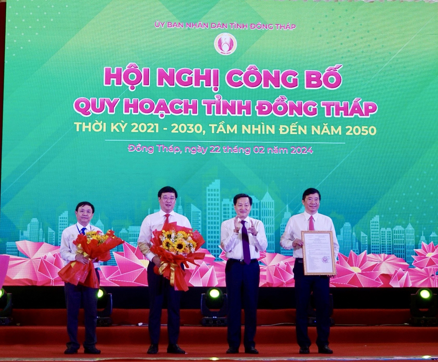 | Phó Thủ tướng Lê Minh Khái trao Quyết định của Thủ tướng phê duyệt Quy hoạch tỉnh Đồng Tháp và tặng hoa chúc mừng lãnh đạo tỉnh Đồng Tháp. |