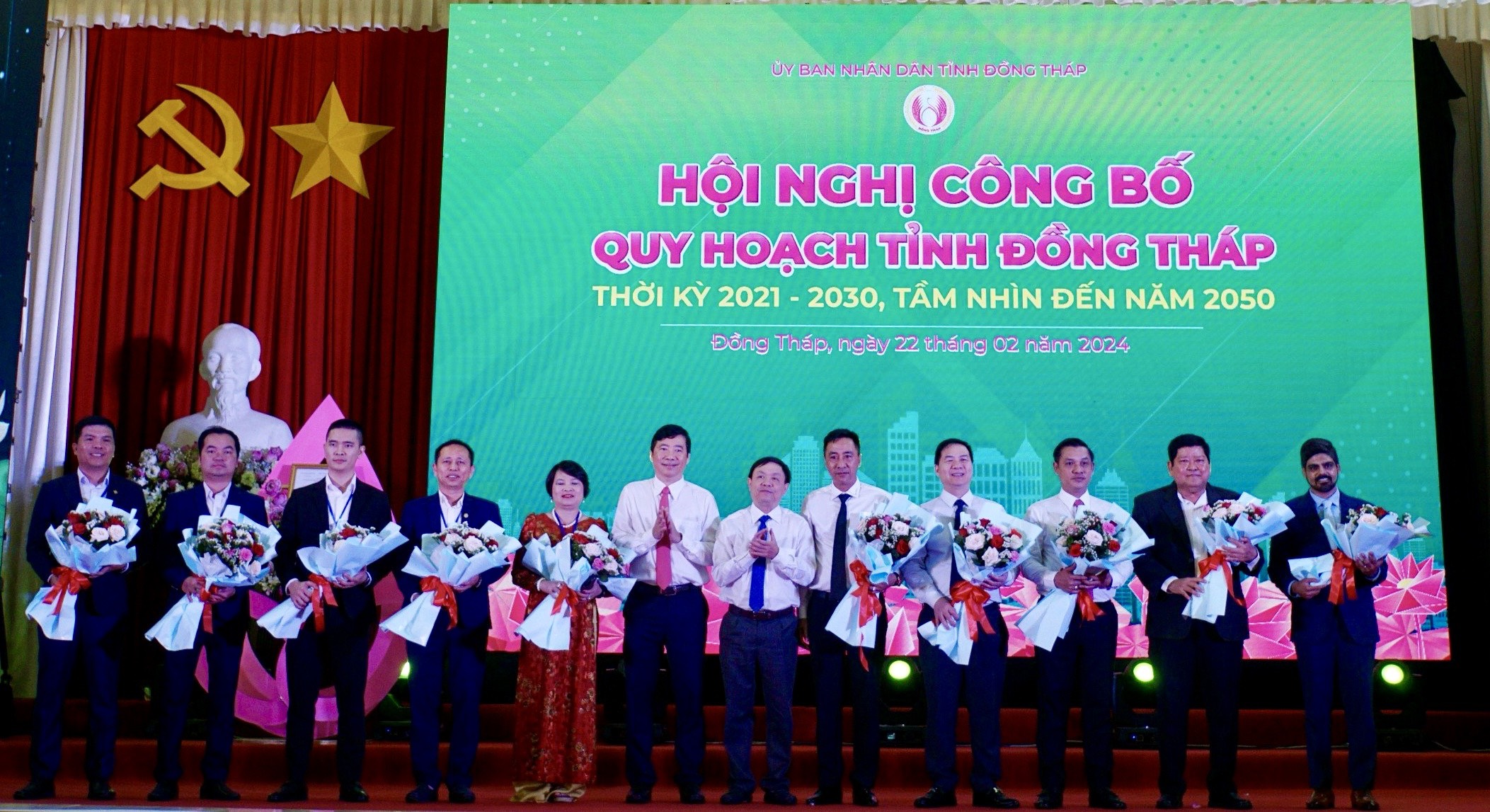 | Lãnh đạo Tỉnh ủy, UBND tỉnh Đồng Tháp tặng hoa chúc mừng các nhà đầu tư, doanh nghiệp đến với Đồng Tháp. |
