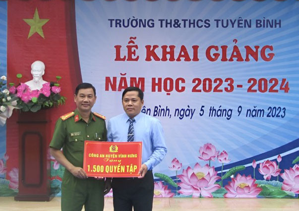 Thượng tá Lê Thanh Thủy - Trưởng Công an huyện Vĩnh Hưng, tặng 1.500 quyển tập cho Trường Tiểu học và THCS Tuyên Bình