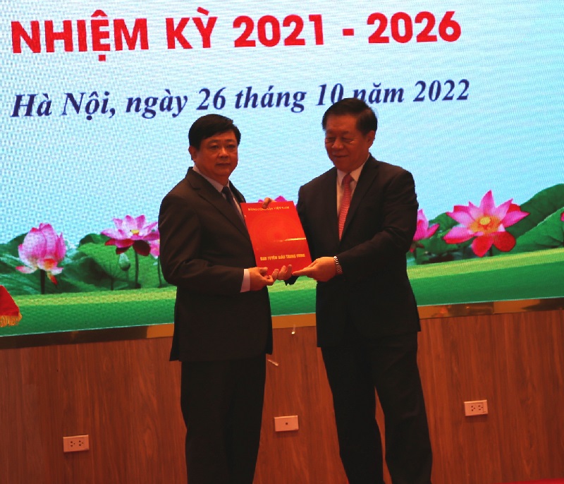 | Bí thư Trung ương Đảng, Trưởng ban Tuyên giáo Trung ương Nguyễn Trọng Nghĩa trao quyết định của Ban Bí thư cho đồng chí Nguyễn Thế Kỷ, Chủ tịch Hội đồng Lý luận, phê bình văn học, nghệ thuật Trung ương nhiệm kỳ 2021-2026. |