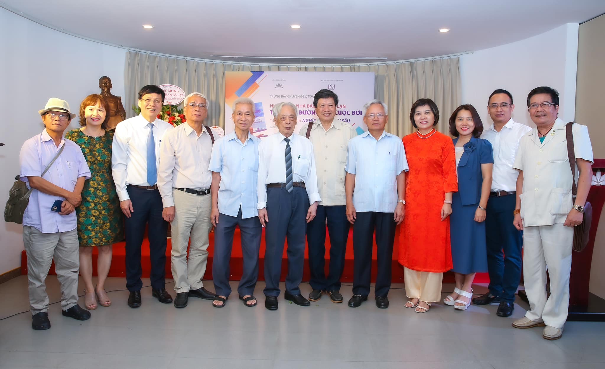 | Nhà báo, nhà giáo Trần Bá Lạn cùng các đại biểu chụp ảnh lưu niệm tại lễ ra mắt sách. |