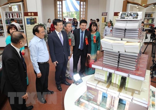 Đại biểu tham quan Tủ sách Thăng Long ngàn năm văn hiến. (Ảnh: Thanh Tùng/TTXVN)