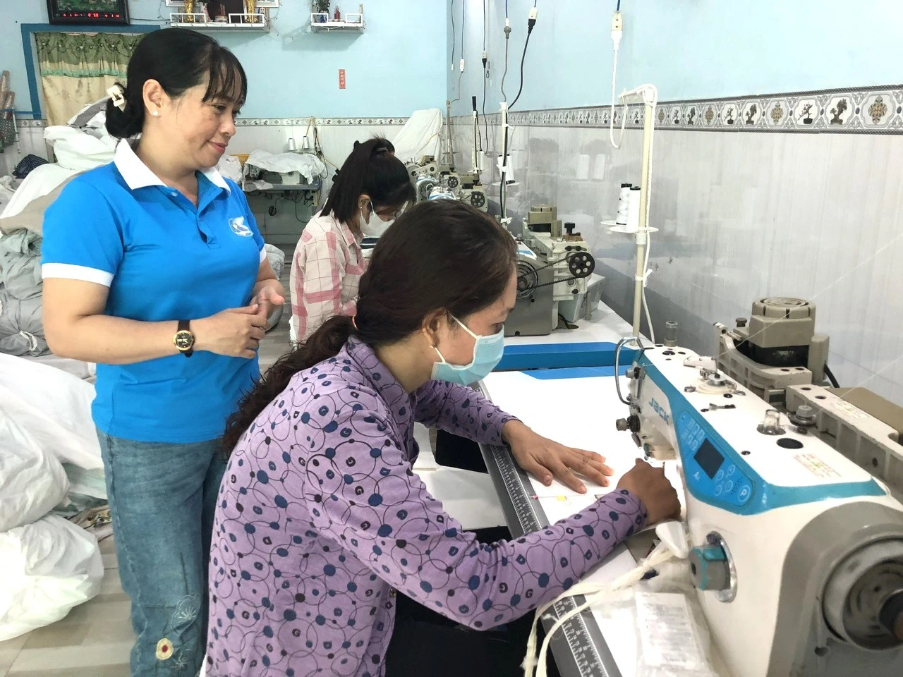 Chị Tô Thị Thành An thăm hỏi, tìm hiểu hoạt động của các thành viên mô hình Tổ Liên kết may gia công do Hội vận động thành lập, góp phần giải quyết việc làm cho chị em. Ảnh: TÂM KHOA