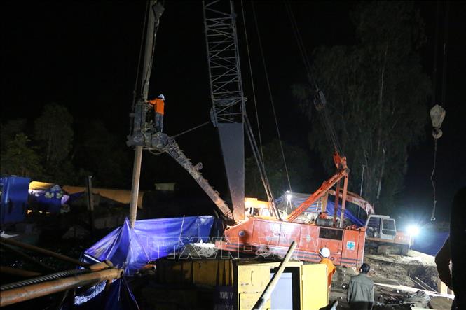 | Hiện trường cứu hộ tại công trình cầu Rọc Sen lúc rạng sáng ngày 20/1/2023. (Ảnh: Nhựt An - TTXVN) |