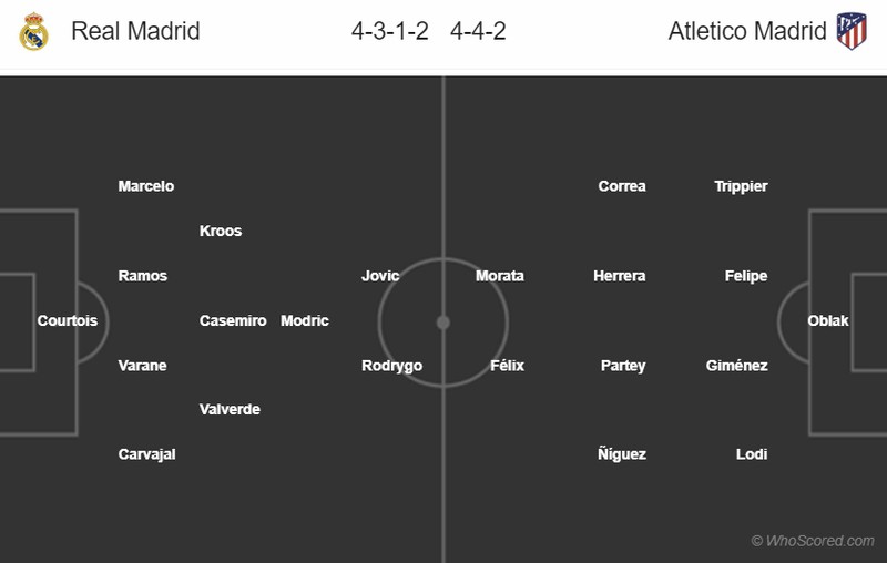 Đội hình dự kiến trận Real Madrid - Atletico Madrid. (Ảnh: Whoscored)