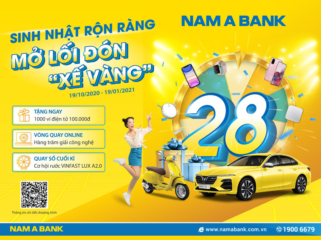 Theo đó, nhân dịp kỷ niệm 28 năm thành lập (21/10/1992 - 21/10/2020), Nam A Bank triển khai nhiều hoạt động nhằm tri ân khách hàng (KH). Cụ thể, 1.000 KH đầu tiên đăng ký dịch vụ Ngân hàng số của Nam A Bank (Open Banking hoặc Mobile Banking) sẽ nhận quà tặng trị giá 100.000 đồng.