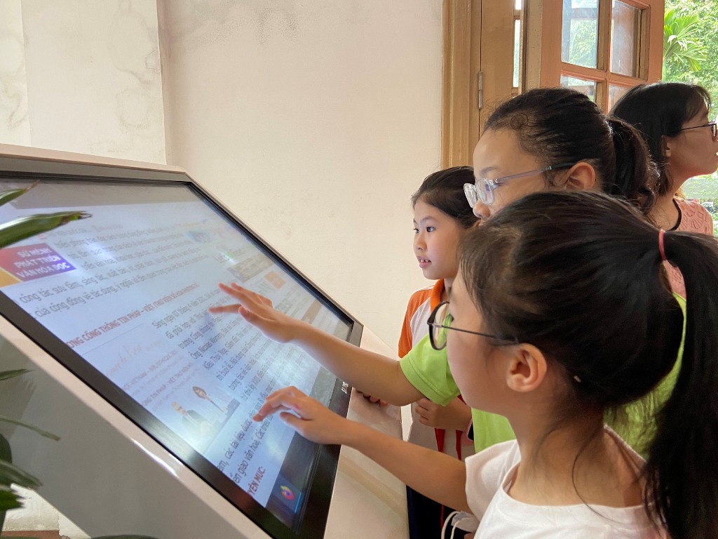 | Các em thiếu nhi khám phá thư viện số trong Ngày hội sách. |