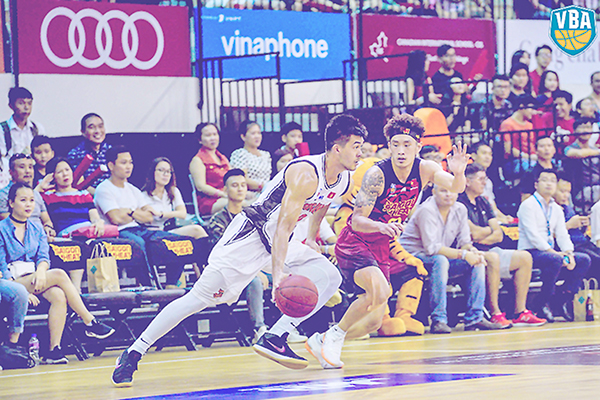 Sau khi đối đầu tại VBA, Trần Đăng Khoa (đang tranh bóng) và Chris Dierker (đang cầm bóng) trở thành đồng đội dưới màu áo Saigon Heat tham dự ABL 18-19. Ảnh: vba.vn