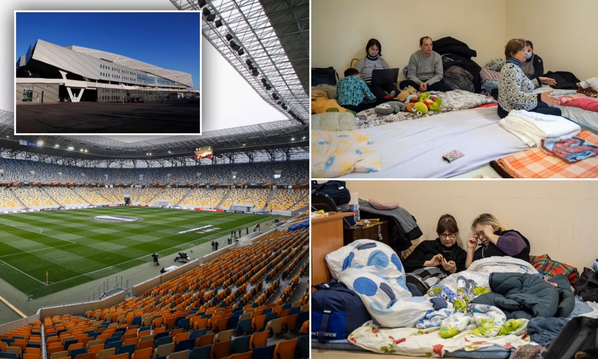 Sân Arena Lviv trở thành nơi trú ẩn cho người tị nạn tại Ukraine. (Ảnh: Daily Mail)