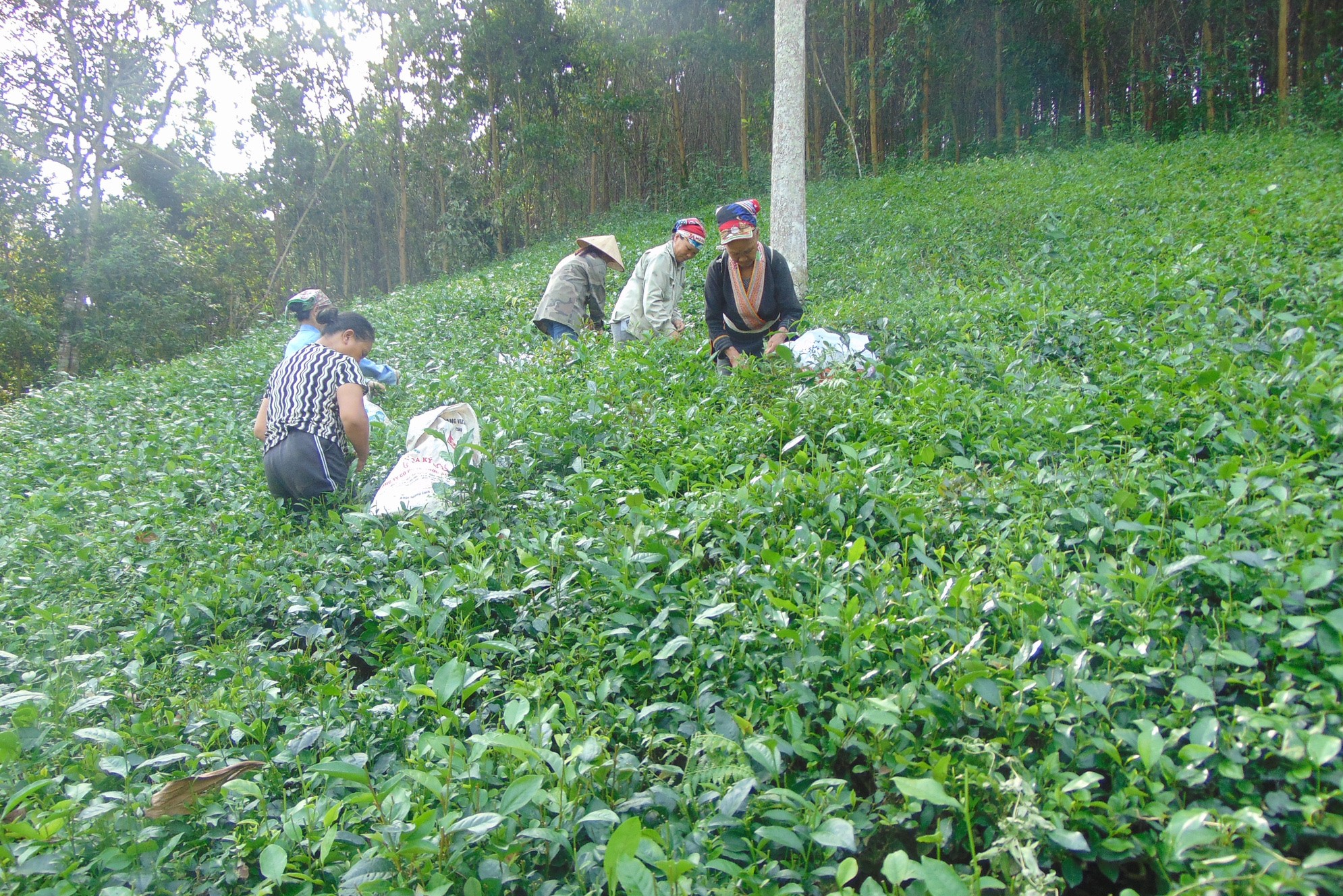 | Các công nhân đang hái chè. Ảnh: Bùi Nga |