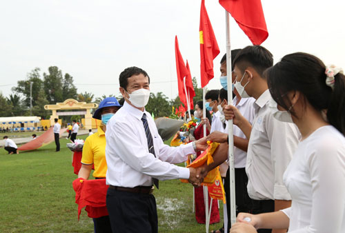 Phó Giám đốc Sở Văn hóa - Thể thao và Du lịch - Nguyễn Hoàng Công tặng cờ lưu niệm cho các đội tại Đại hội Thể dục - thể thao huyện Vĩnh Hưng