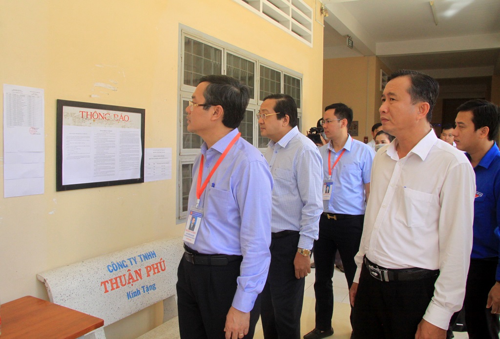 Thứ trưởng Bộ Giáo dục và Đào tạo - Nguyễn Văn Phúc (bìa trái) kiểm tra các phòng thi tại điểm thi Trường THPT Chuyên Long An