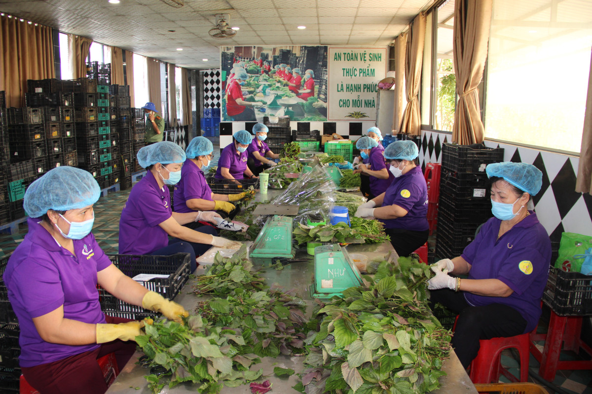 Công nhân sơ chế rau trước khi giao cho khách hàng