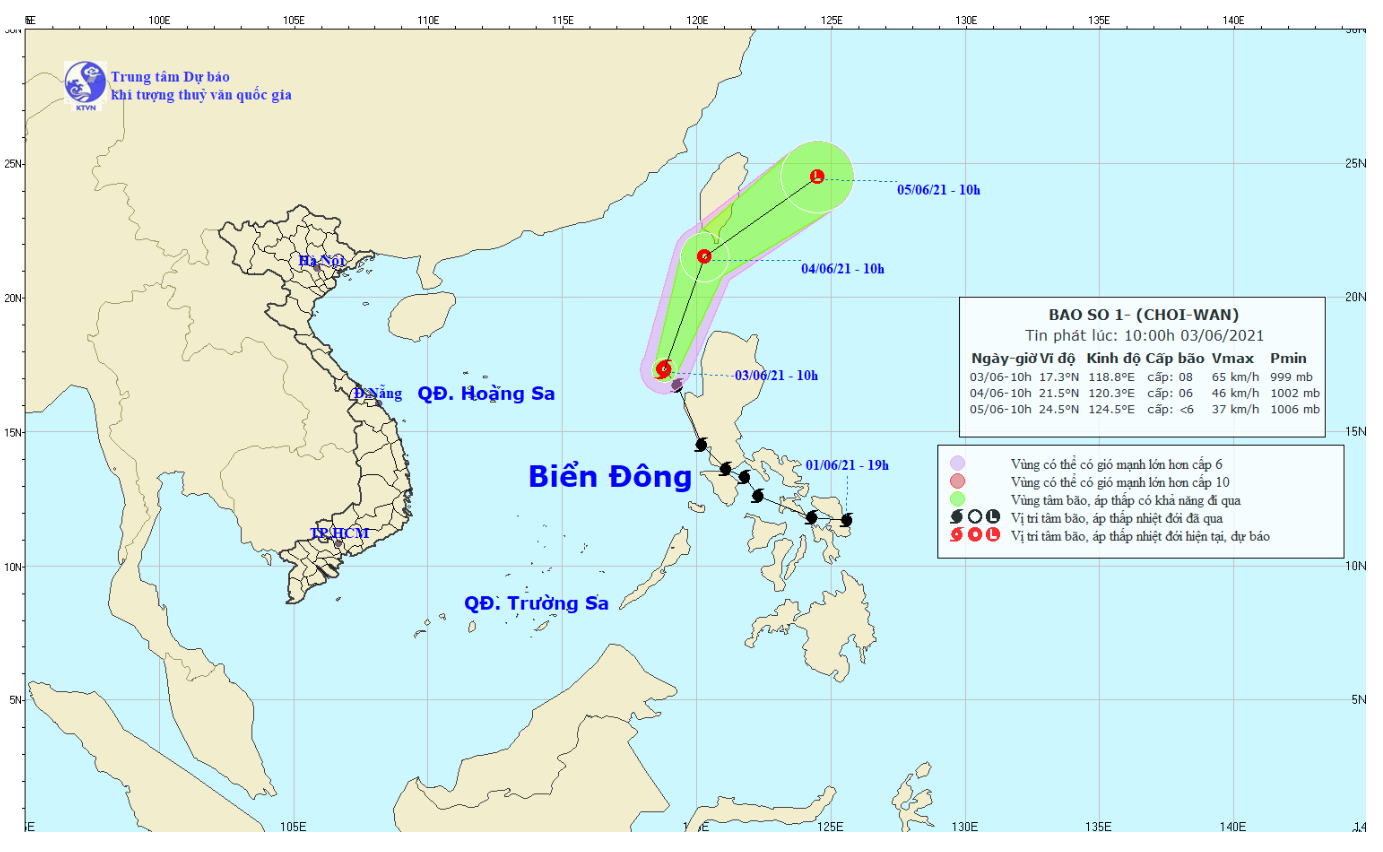 Theo bản tin của Trung tâm Dự báo khí tượng thủy văn Quốc gia, sáng 3/6, bão Choi-Wan đã vượt qua đảo Lu-Dông (Phi-lip-pin) đi vào Đông Bắc Biển Đông thành cơn bão số 1 trên Biển Đông. Hồi 7 giờ ngày 03/6, vị trí tâm bão ở vào khoảng 16,7 độ Vĩ Bắc; 119,3 độ Kinh Đông, sức gió mạnh nhất vùng gần tâm bão mạnh cấp 8, giật cấp 10. Dự báo trong 24 giờ tới, bão số 1 di chuyển lên phía Bắc sau đó đổi hướng Đông Bắc đi ra ngoài Biển Đông và suy yếu thành áp thấp nhiệt đới.
