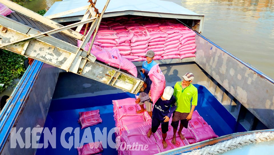Công nhân Xí nghiệp chế biến gạo xuất khẩu Tân Hiệp thuộc Công ty Cổ phần Thương mại Kiên Giang Tân Hiệp chuẩn bị đưa gạo đi xuất khẩu.
