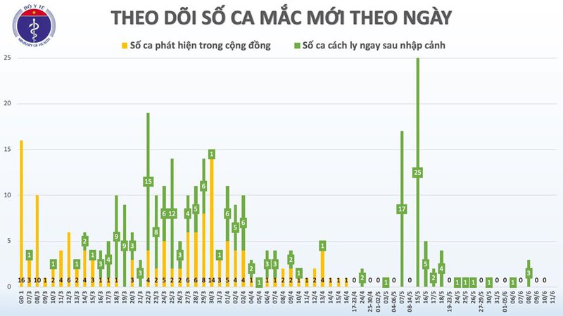 Tính từ 6h sang 16/4 đến 6h sáng 11/6 (56 ngày), Việt Nam không có ca lây nhiễm Covid-19 trong cộng đồng.
