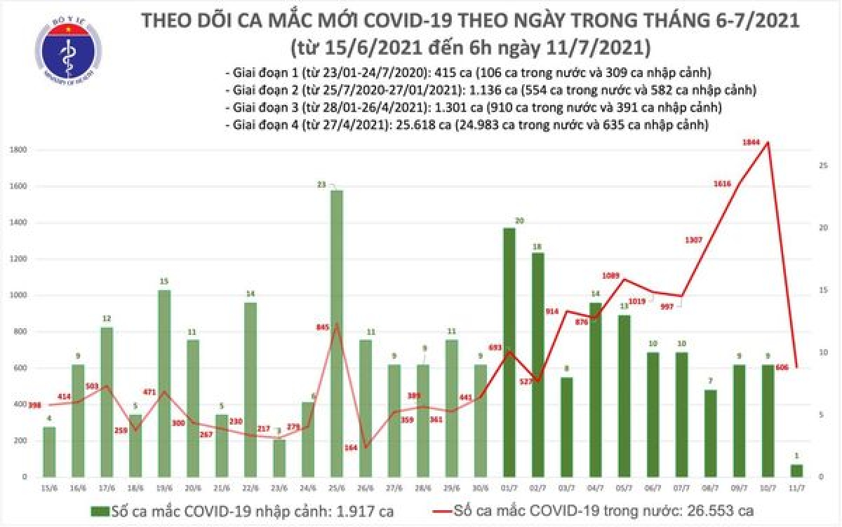 Tính từ 19h ngày 10/7 đến 6h ngày 11/7, cả nước có 607 ca mắc COVID-19 mới, gồm 1 ca cách ly ngay sau khi nhập cảnh tại An Giang và 606 ca ghi nhận trong nước tại TP.HCM (443), Tiền Giang (46), Vĩnh Long (43), Bình Dương (39), Hậu Giang (9), Bến Tre (7), An Giang (7), Phú Yên (4), Bắc Ninh (3), Bình Phước (2), Cà Mau (1), Quảng Nam (1) và Bạc Liêu (1); trong đó 434 ca được phát hiện trong khu cách ly hoặc khu đã được phong toả.