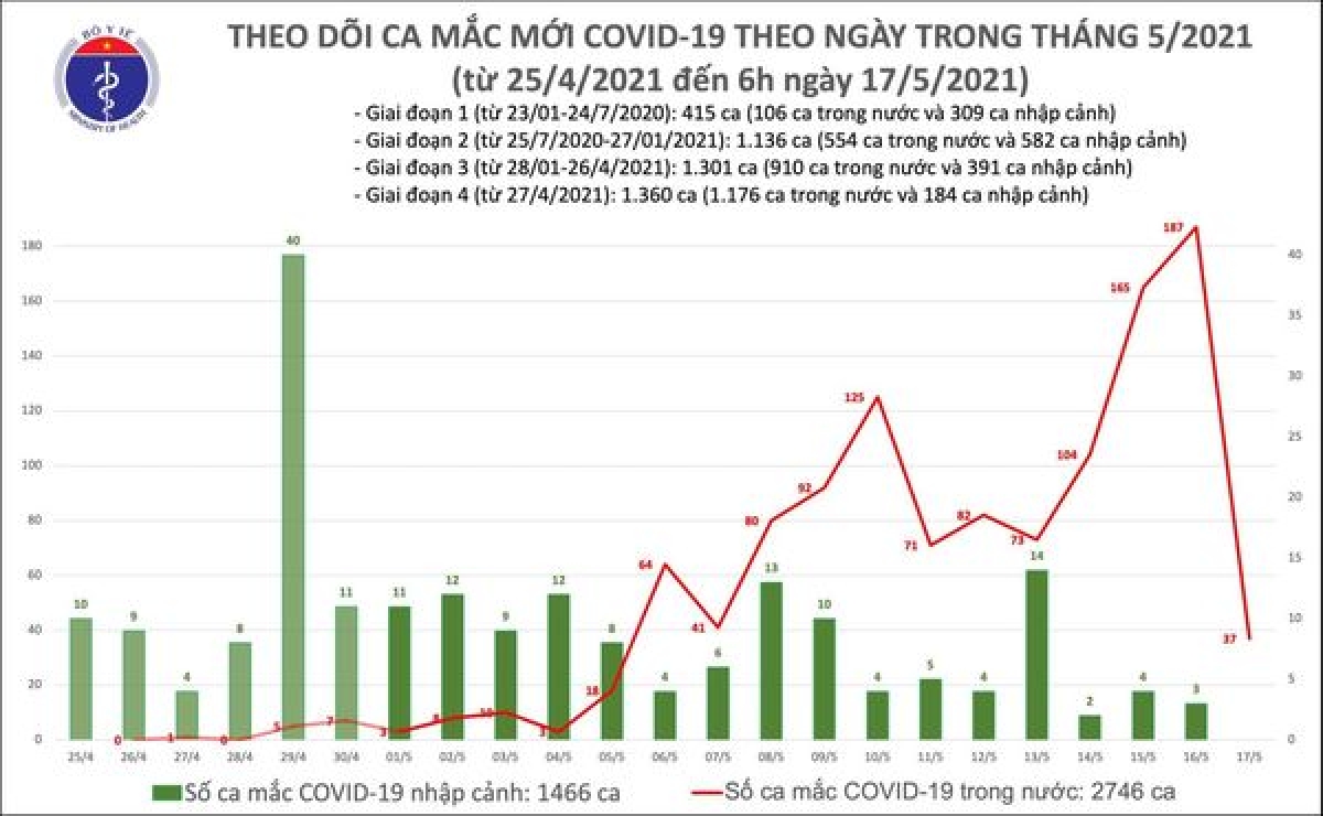 Tính đến 6h ngày 17/5, Việt Nam có tổng cộng 2.746 ca ghi nhận trong nước và 1.466 ca nhập cảnh. Số ca mắc mới tính từ ngày 27/4 đến nay là 1.176 người. Số lượng mẫu xét nghiệm từ 29/4 đến nay là 482.900 mẫu.