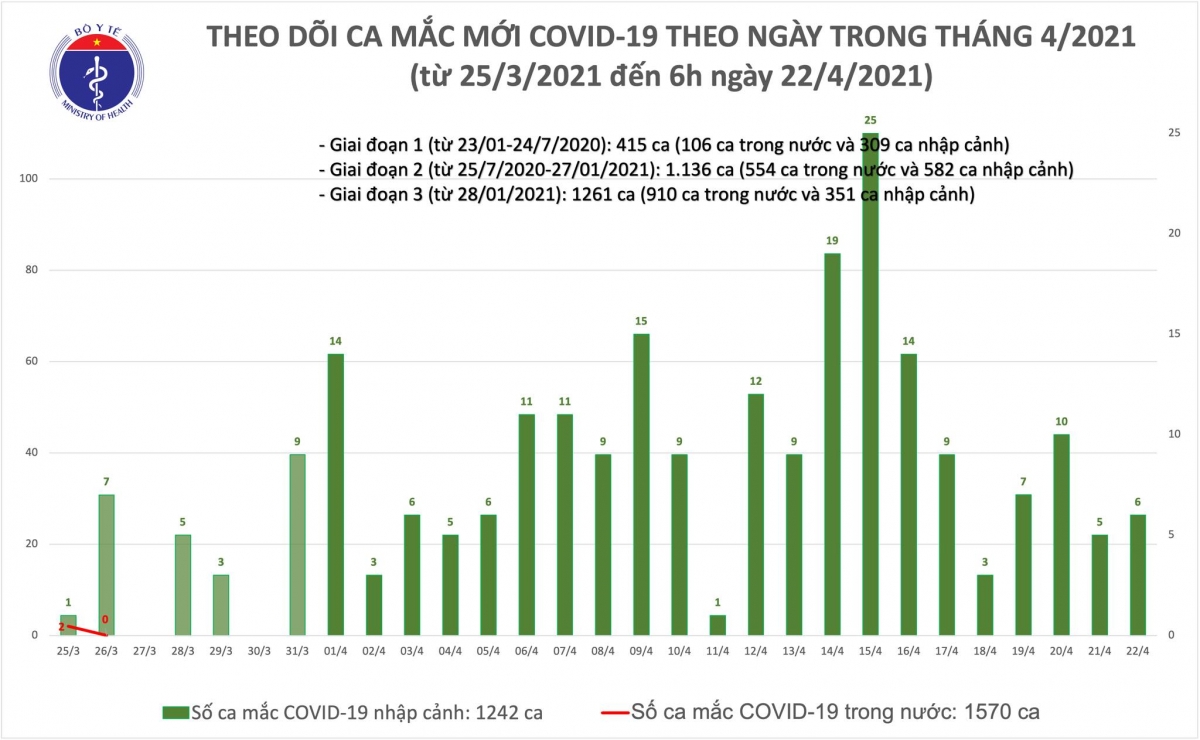Theo Bộ Y tế, Tính đến 6h ngày 22/4: Việt Nam có tổng cộng 1570 ca mắc COVID-19 do lây nhiễm trong nước, trong đó số lượng ca mắc mới tính từ ngày 27/1 đến nay: 910 ca.