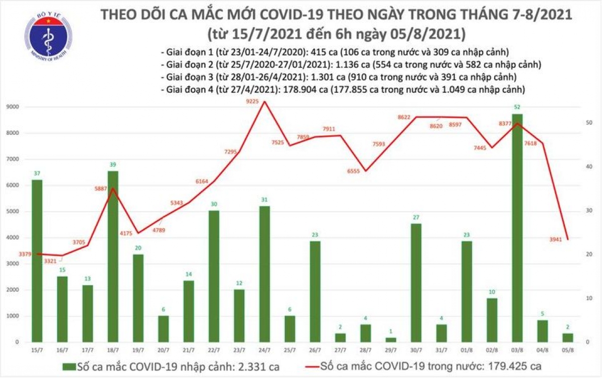 Tính từ 18h30 ngày 4/8 đến 6h ngày 5/8, trên Hệ thống Quốc gia quản lý ca bệnh COVID-19 cập nhật 3.943 ca mắc mới, gồm 2 ca nhập cảnh và 3.941 ca ghi nhận trong nước (giảm 326 ca so với sáng 4/8).