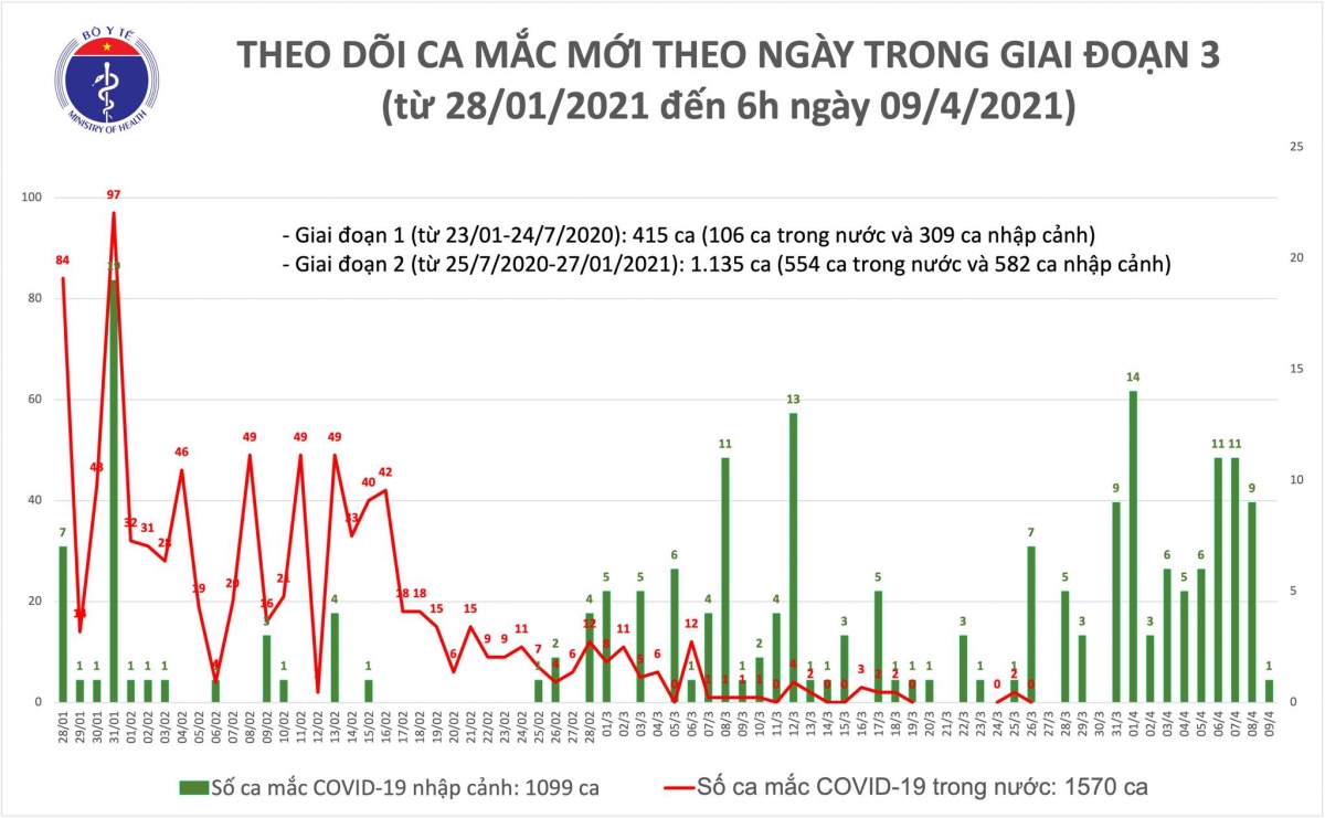 Bộ Y tế cho biết, ính đến 6h ngày 09/4: Việt Nam có tổng cộng 1570 ca mắc COVID-19 do lây nhiễm trong nước, trong đó số lượng ca mắc mới tính từ ngày 27/1 đến nay: 910 ca.