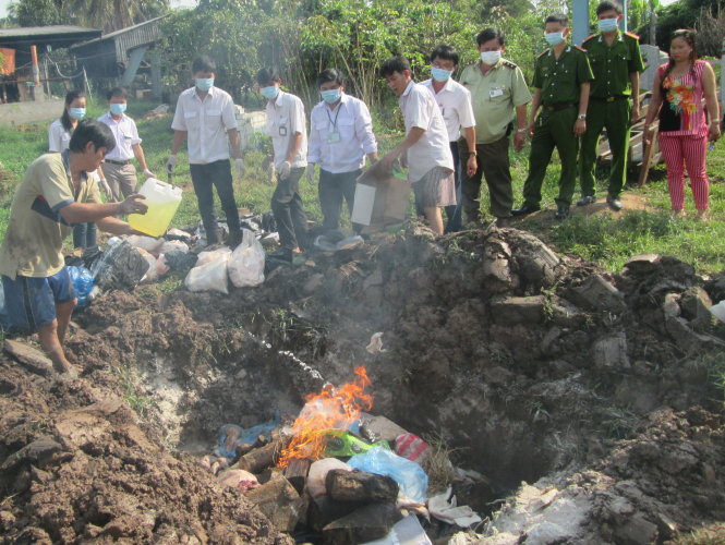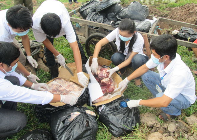 Tiêu hủy 460kg nội tạng và thịt heo đã biến đổi màu, bốc mùi hôi thối phát hiện tại nhà bà Vân - Ảnh: ĐỨC VỊNH