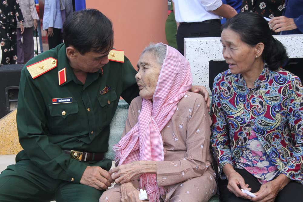 Nắm lấy đôi bàn tay gầy guộc, nhăn nheo, Thiếu tướng Nguyễn Minh Hoàng ghé sát tai Mẹ Việt Nam Anh hùng Thạch Thị Thảnh, ngụ ấp 1, ân cần thăm hỏi sức khỏe và dặn dò người thân chăm sóc mẹ chu đáo.