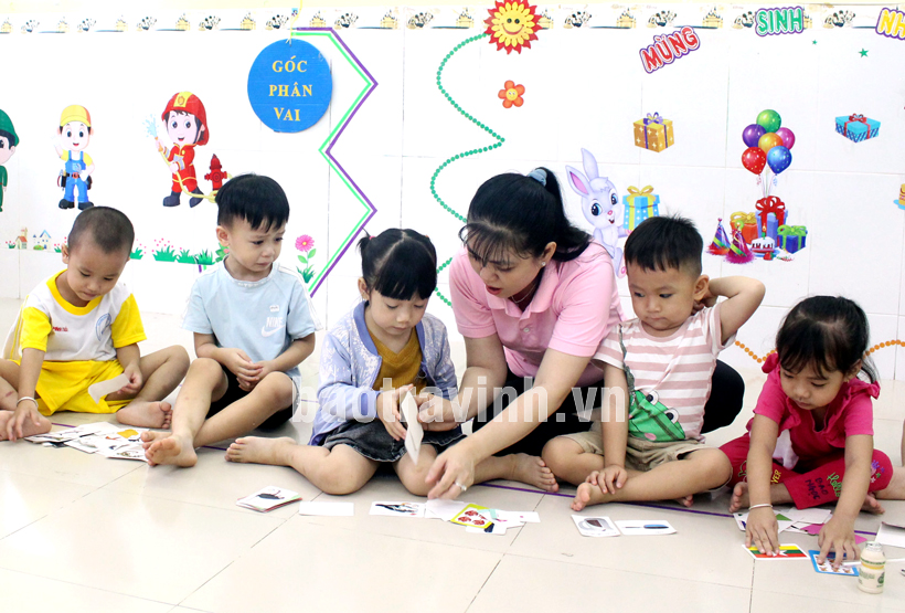 Giáo viên tổ chức hoạt động vui chơi cho trẻ mầm non vào ngày tựu trường.