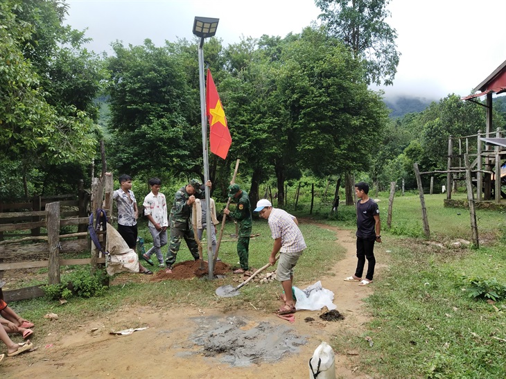 | Cán bộ, chiến sĩ Đồn Biên phòng Làng Mô và đoàn viên, thanh niên thuộc Đoàn Thanh niên xã Trường Sơn xây dựng công trình “Ánh sáng vùng biên” tại bản Dốc Mây. Ảnh: Thanh Nam. |