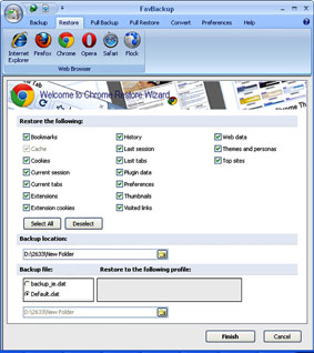 Với FavBackup bạn có thể sao lưu và khôi phục cấu hình trên Firefox, Internet Explorer, Google Chrome, Safari, Opera và Flock.