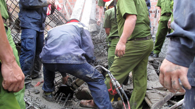 Lực lượng Cảnh sát PCCC tỉnh Bình Định dùng thiết bị chuyên dụng để cắt khối bê tông, đưa nạn nhân ra ngoài - Ảnh: N.Trần