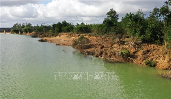| Bờ sông Hiếu đoạn qua xã Cam Thủy, huyện Cam Lộ bị sạt lở nghiêm trọng. (Ảnh: TTXVN) |