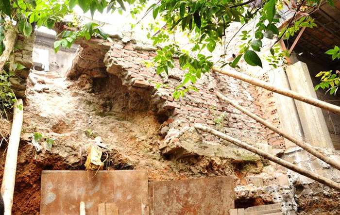 Trong quá trình thi công, do bị đào mất chân đế, đất và tường gạch ốp ta luy vách ngăn bất ngờ sập đổ.