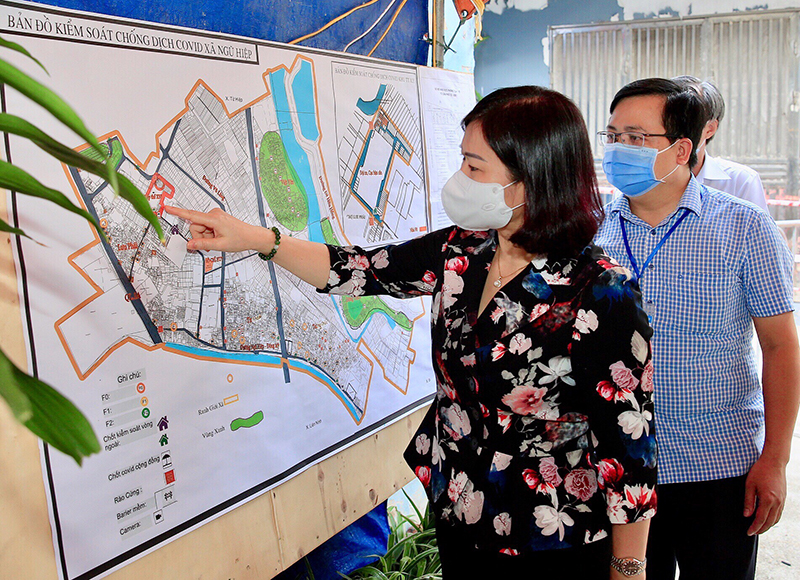 | Phó Bí thư Thường trực Thành ủy Hà Nội Nguyễn Thị Tuyến rà soát thông tin “vùng đỏ” trên bản đồ kiểm soát chống dịch COVID-19 xã Ngũ Hiệp. |